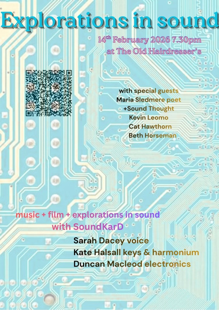 We’re very pleased to be joined by very special guests next Saturday night at The Old Hairdressers- poet Maria Sledmere and Glasgow’s Sound Thought members Kevin Leomo, Cat Hawthorne and Beth Hawthorne. With film by our long time collaborator Phil Maguire.